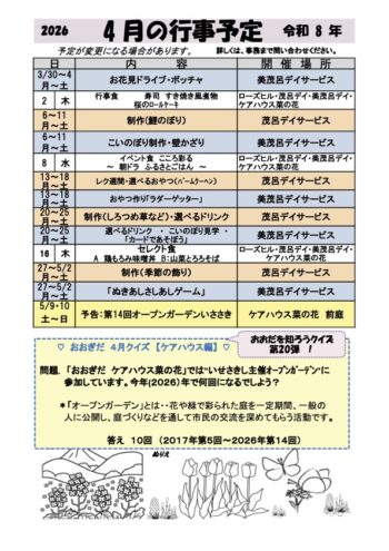 4月の行事予定表を作成いたしました。
